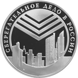 Sberbank's Moscow headquarters, topped with its emblem, against the Moscow City skyline. Rim inscription: "СБЕРЕГАТЕЛЬНОЕ ДЕЛО В РОССИИ" (THE SAVINGS-AFFAIRS IN RUSSIA).