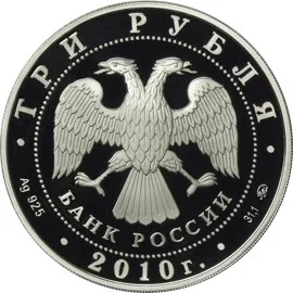 Center: Bank of Russia emblem (two-headed eagle, wings down, with "БАНК РОССИИ" below), within a dotted circle. Rim inscriptions: top - "ТРИ РУБЛЯ"; bottom left - metal and fineness; center - "2010 г."; bottom right - metal content and mint mark.