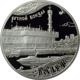 A river hydrofoil in the foreground, labeled "YAROSLAVL," with the Yaroslavl River Station building and its sign centered in the background.