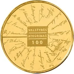 Reverse: facsimile signatures of the signatories to Lithuania's 16 February 1918 Act of Independence.