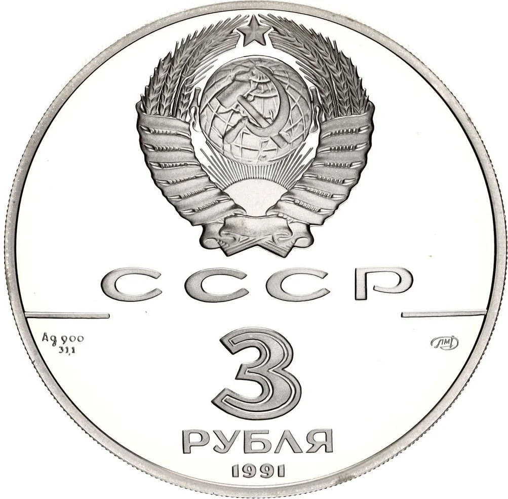 USSR coat of arms with "СССР," 31.1 g, Ag 900, signature, 3 РУБЛЯ, and 1991.