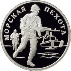 A modern marine centered on a shore, with a running marine to the left and a landing ship to the right. The rim inscription reads: «МОРСКАЯ ПЕХОТА» (THE MARINES).