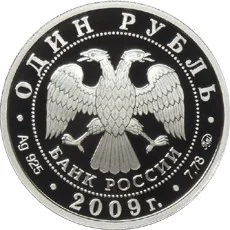 Center: Bank of Russia emblem (two-headed eagle, wings down, with "БАНК РОССИИ" below), circled by dots. Rim inscriptions: top - "ОДИН РУБЛЬ"; bottom left - metal and fineness; center - "2009 г."; bottom right - metal content and mint mark.
