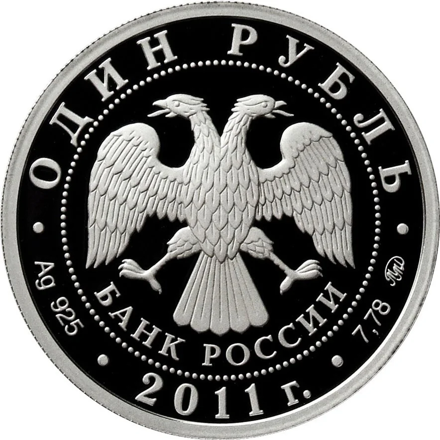 Central: Bank of Russia emblem (two-headed eagle, wings down, with "БАНК РОССИИ" below) within a dotted circle. Rim inscriptions: top - "ОДИН РУБЛЬ"; bottom left - metal and fineness; centre - "2011 г."; bottom right - metal content and mint mark.