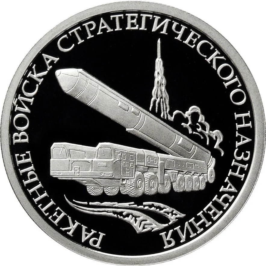 A mobile rocket launcher on a truck, with a rocket launching amid smoke in the background. Encircling text: "РАКЕТНЫЕ ВОЙСКА СТРАТЕГИЧЕСКОГО НАЗНАЧЕНИЯ" (THE STRATEGIC ROCKET FORCES).