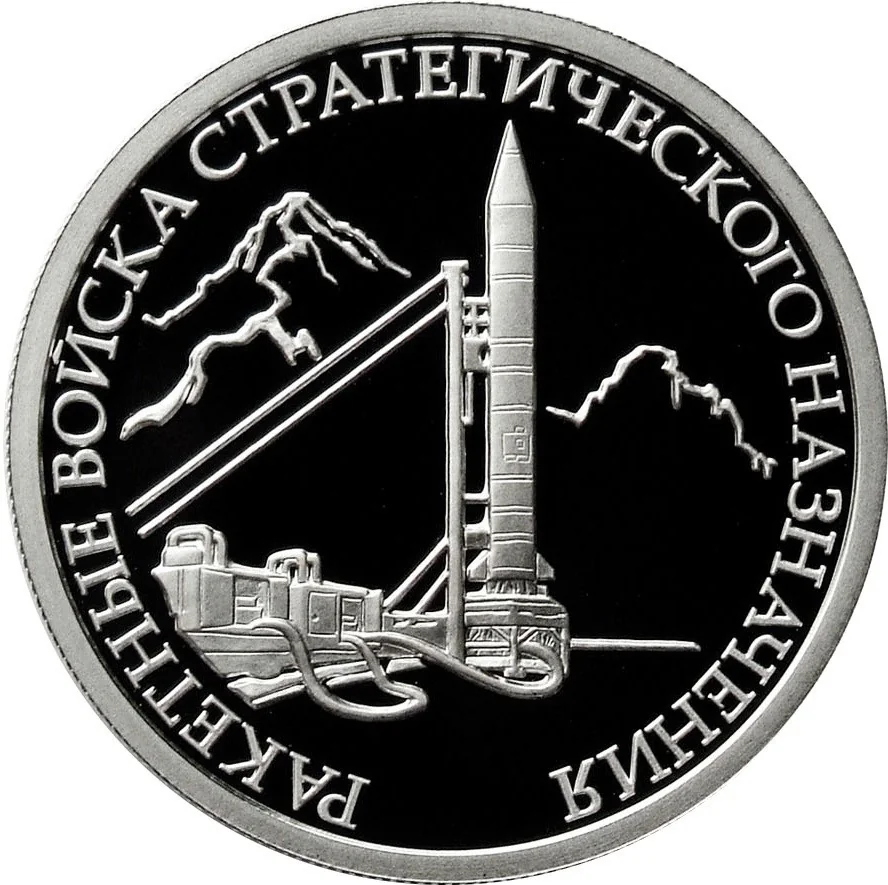 Center: R-12 ground rocket complex. Background: mountain outlines. Rim: circular inscription "РАКЕТНЫЕ ВОЙСКА СТРАТЕГИЧЕСКОГО НАЗНАЧЕНИЯ" (THE STRATEGIC ROCKET FORCES).