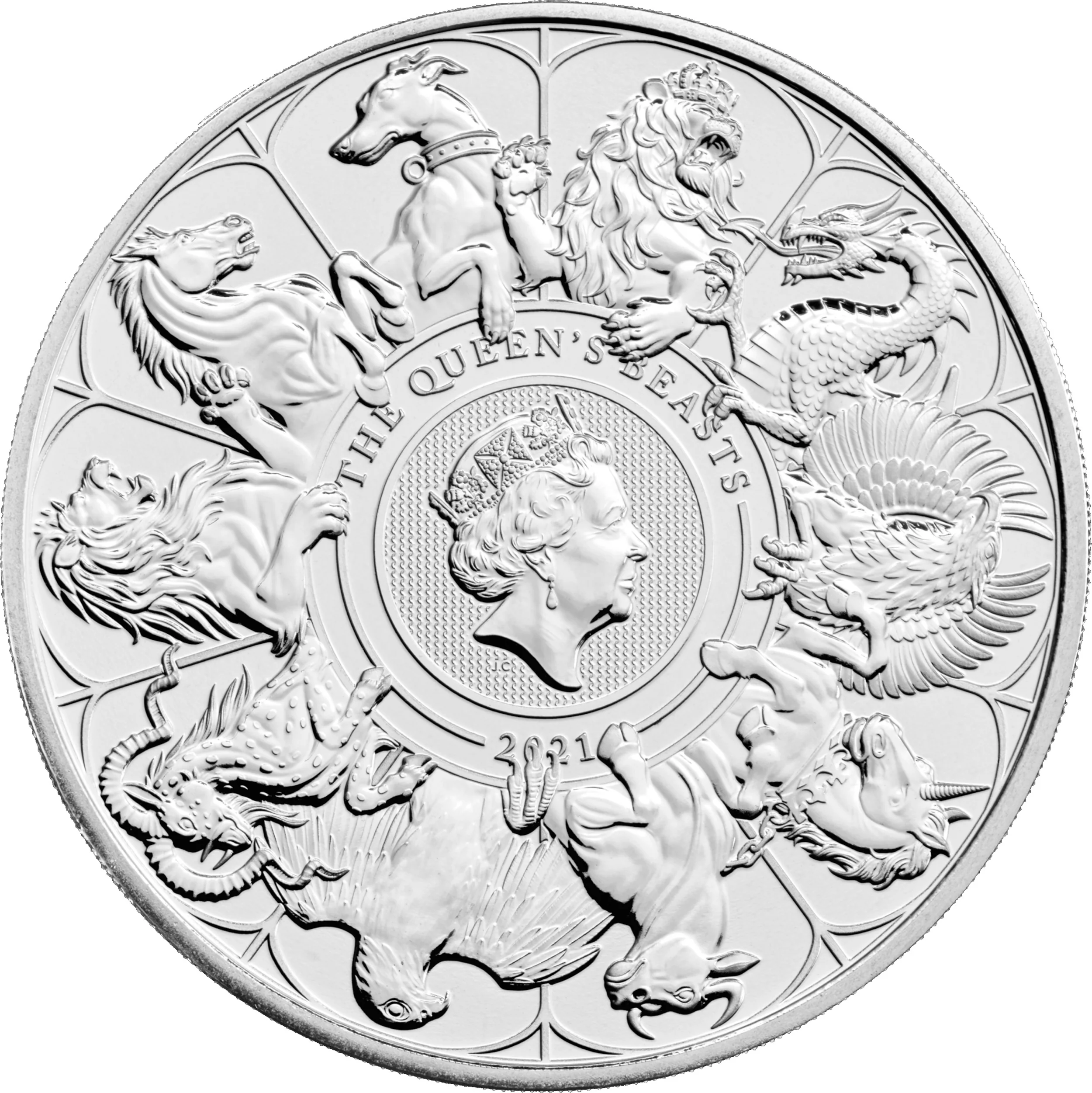 Ten heraldic beasts encircling the Queen's portrait, with legend above and date below.