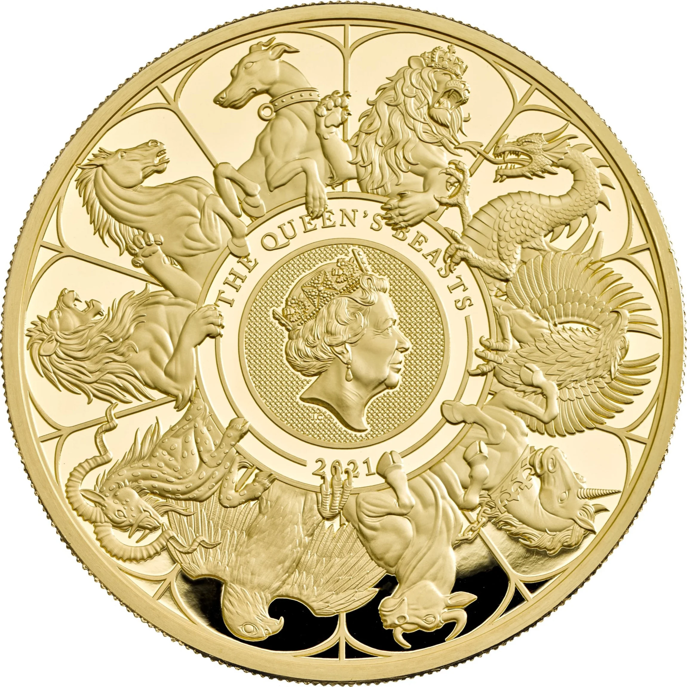 Ten heraldic beasts encircling the Queen's portrait, with legend above and date below.