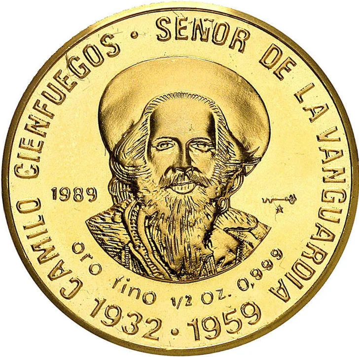 Bust of Camilo Cienfuegos. Legend on top and sides, life years below. Issue year left, mintmark right. Weight and fineness beneath.