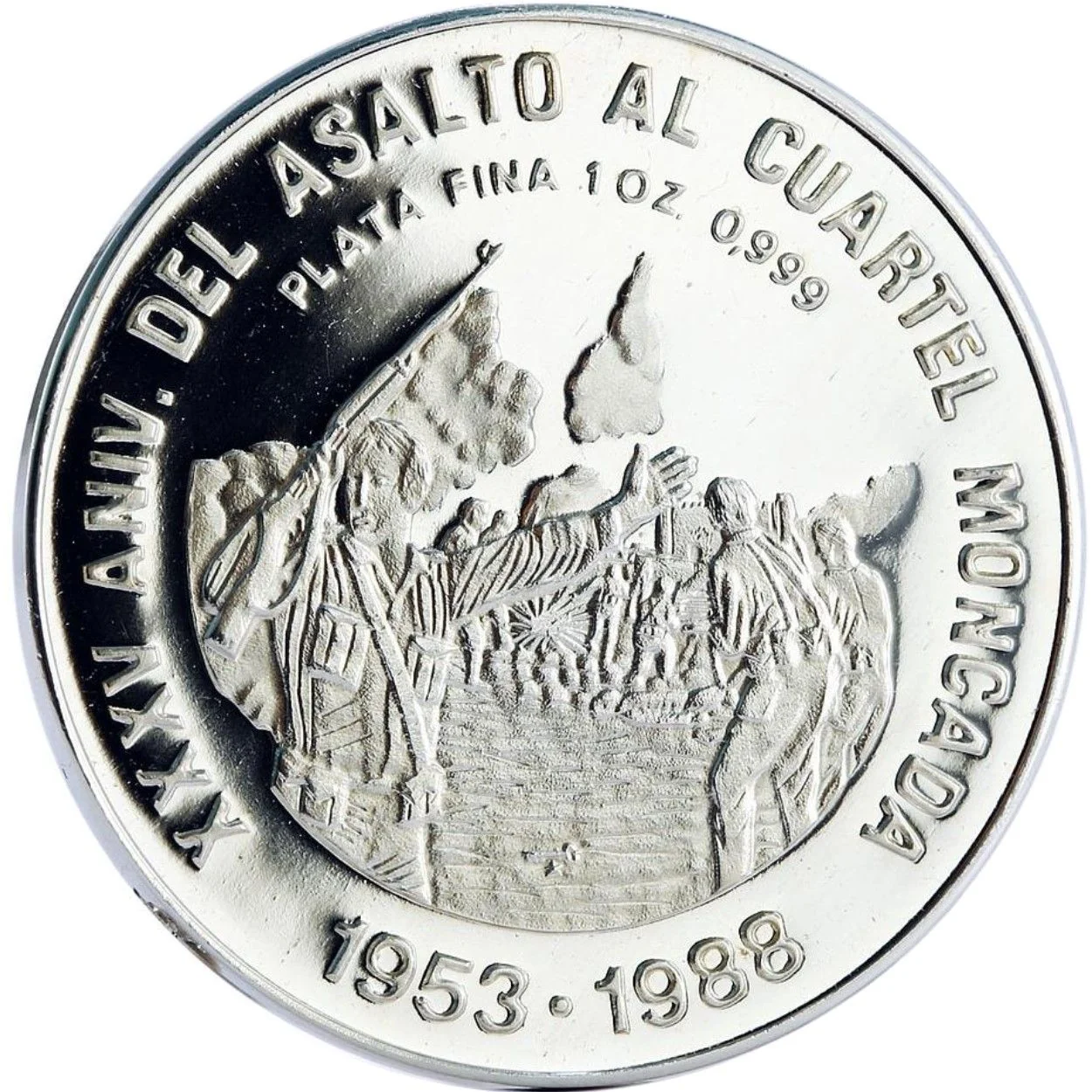 Assault on Moncada Garrison, curved legend above, dates below. Mintmark under image. Weight and fineness above image.