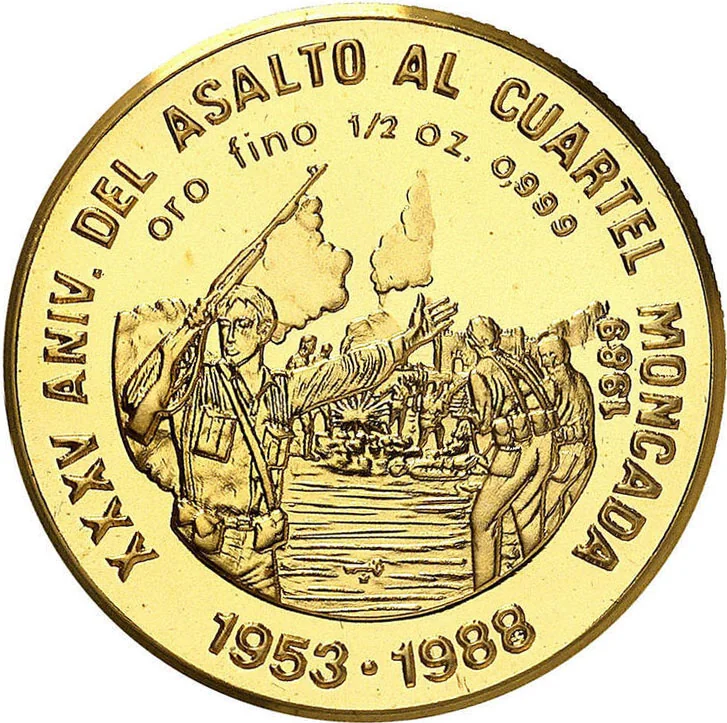 Assault on Moncada Garrison, curved along top and sides. Dates below, issue year right. Mintmark under image. Weight and fineness above.