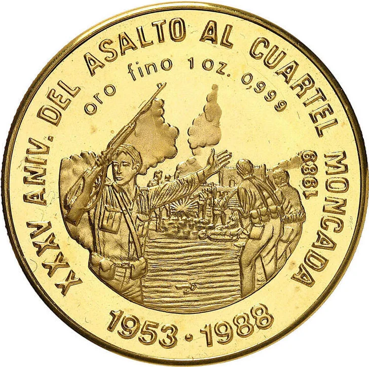 Assault on Moncada Garrison, curved along top and sides. Dates below, issue year right. Mintmark under image. Weight and fineness above.