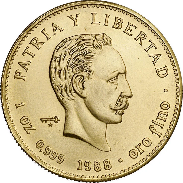 Portrait of José Martí right, motto above, mintmark left, issue date below, weight and fineness on sides.
