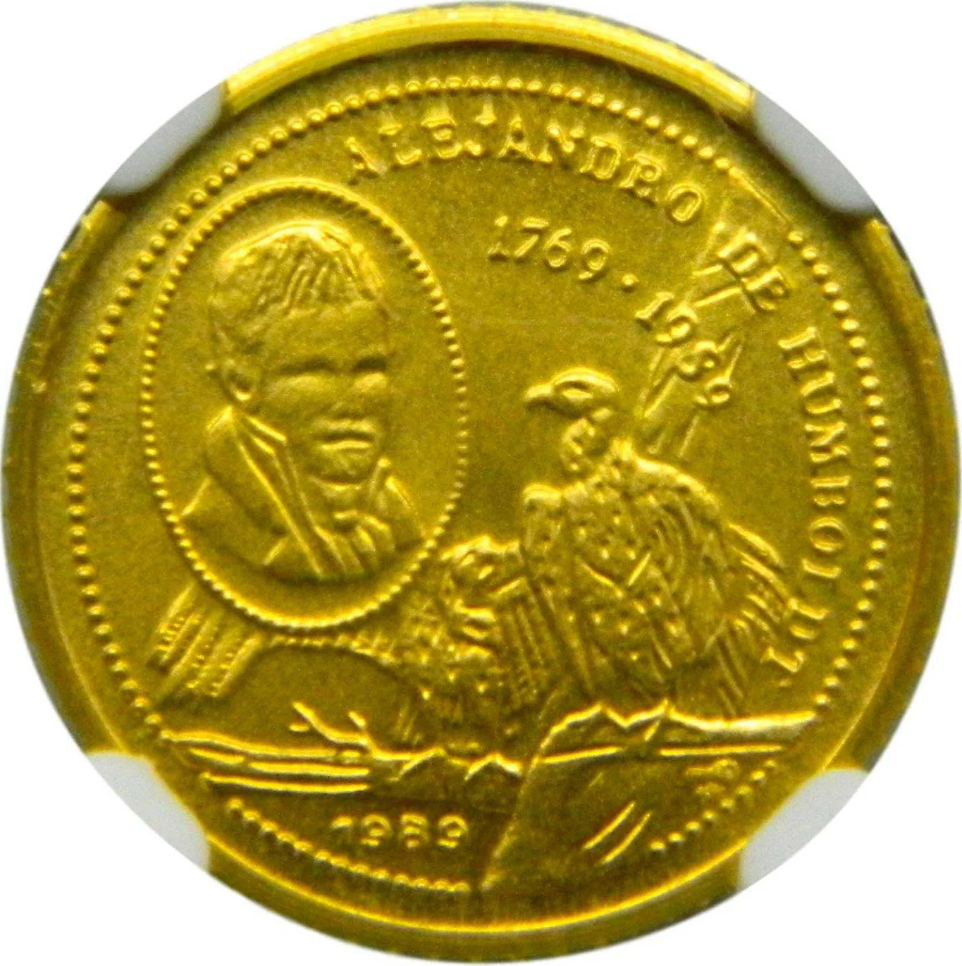 Portrait of Alejandro de Humboldt with two condors. Name and life years curved top right, issue date below.