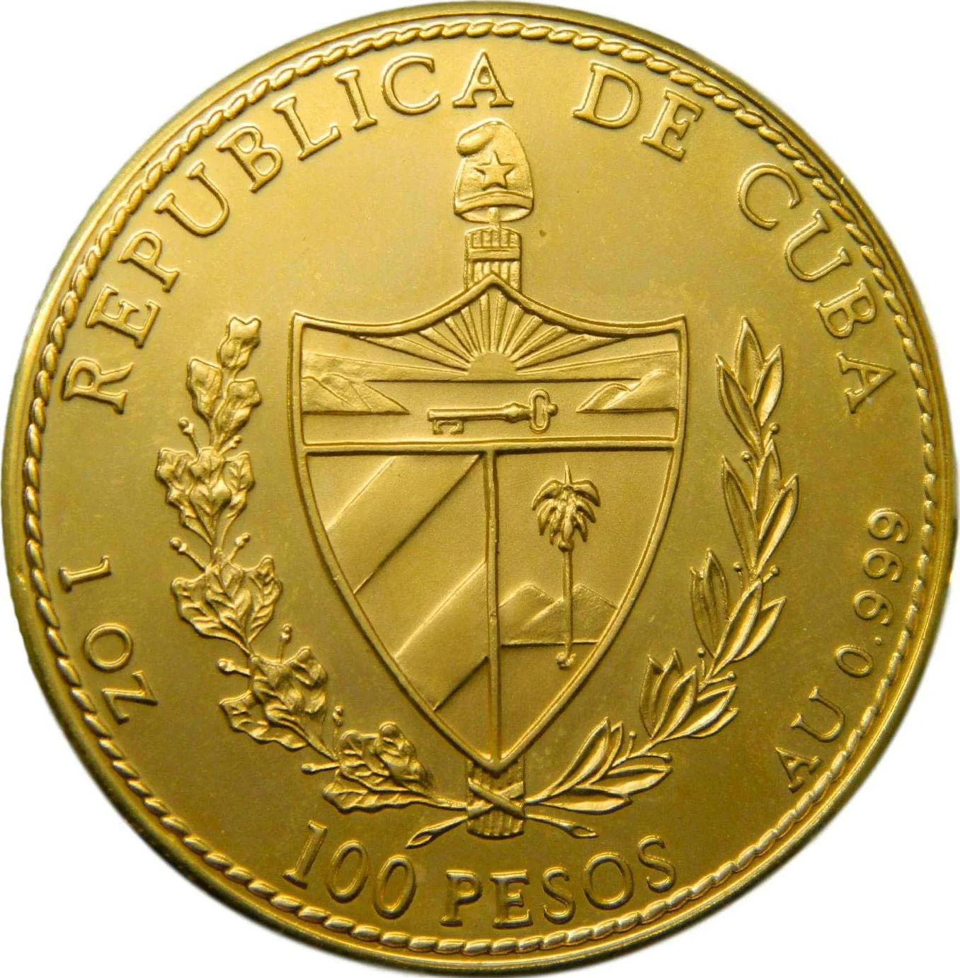 Cuban coat of arms with curved country name above, face value below, weight and fineness on sides, rope edge design.