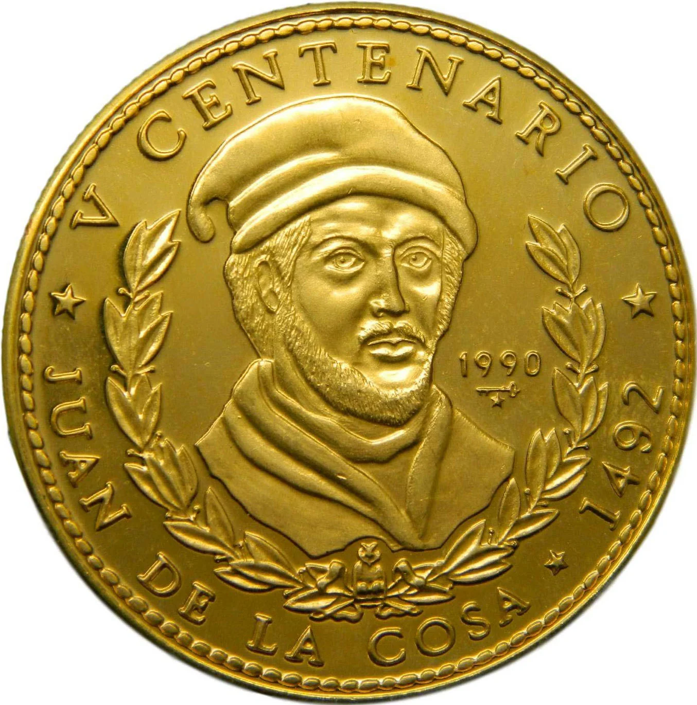 Juan de la Cosa portrait in wreath, name below. Event and date above and right, mintmark and issue to image's right. Rope border near edge.
