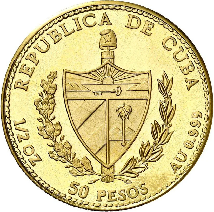 Cuban coat of arms with curved country name above, face value below, weight and fineness on sides, rope edge design.