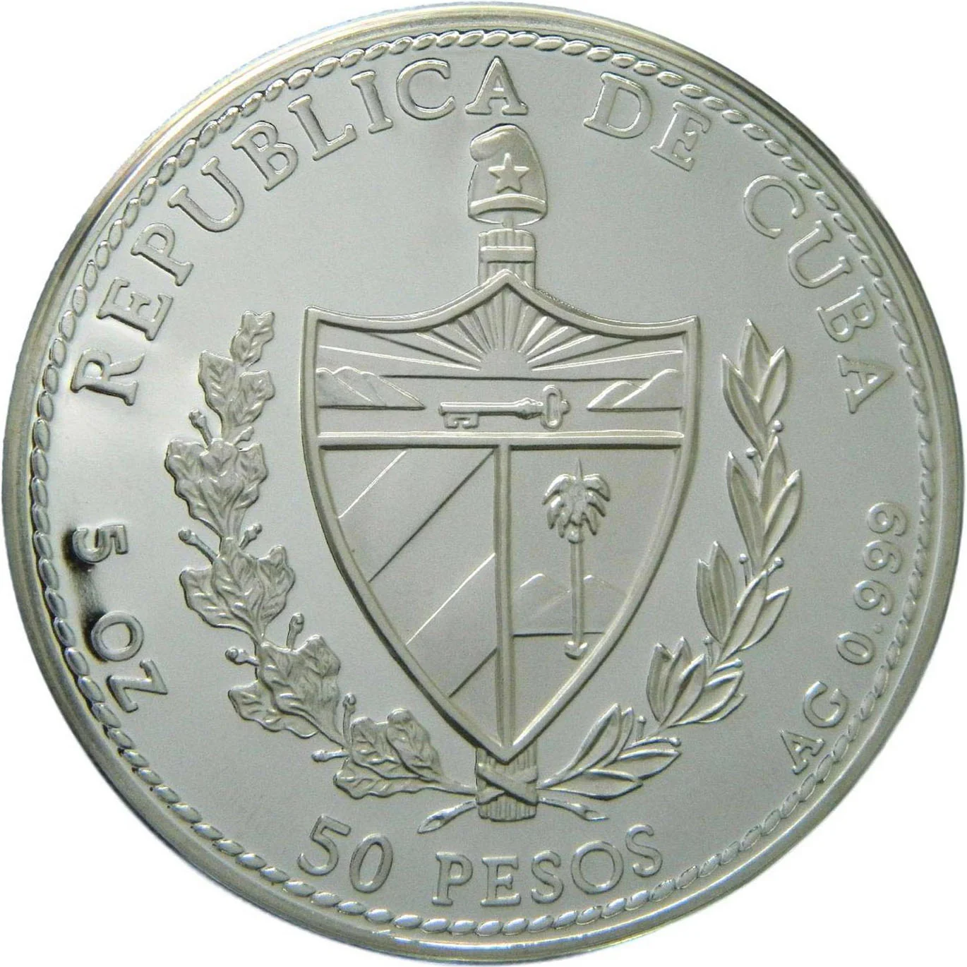 Cuban coat of arms with curved country name above, face value below, weight and fineness on sides, rope edge design.