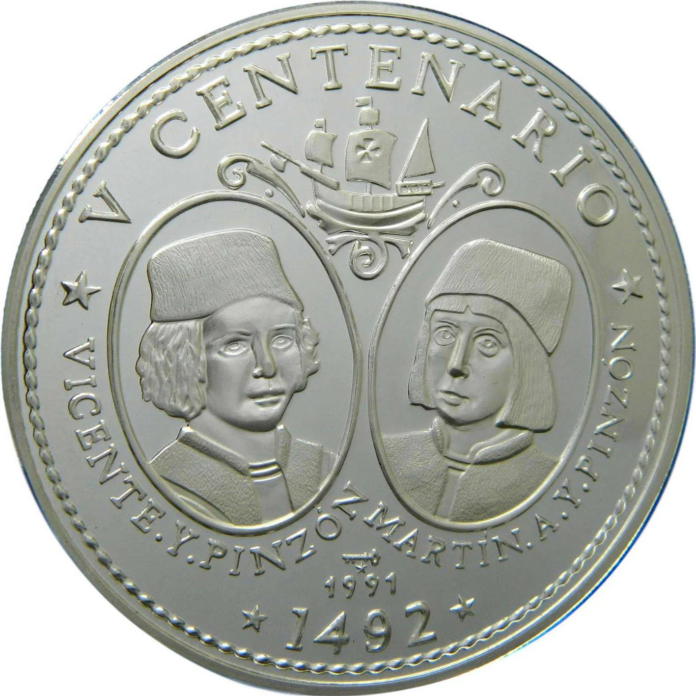Portrait ovals of the Pinzón brothers with names below. Top: ship and event. Bottom: date. Mintmark and issue year under portraits. Rope border near edge.