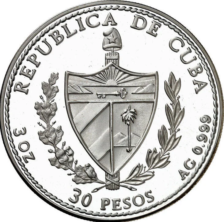 Cuban coat of arms with country name above, face value below, weight and fineness on sides, rope border.