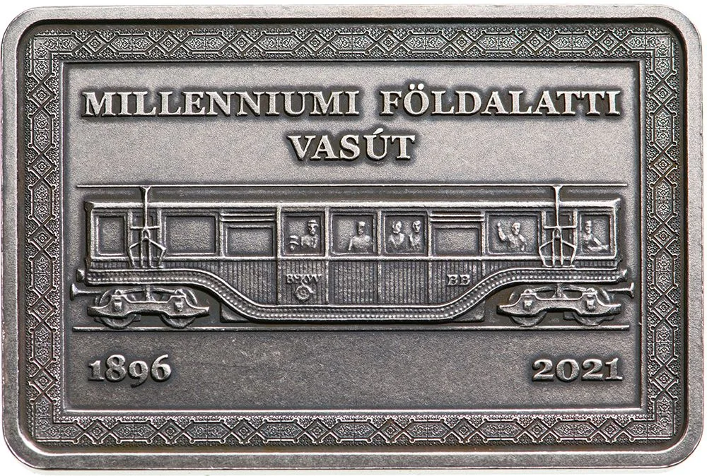 The reverse features a side view of a wooden-panelled BFKVV-model underground railcar. Above it are the inscriptions "MILLENNIUMI FÖLDALATTI" and "VASÚT." Below are the years 1896 (left) and 2021 (right). The designer's mark is on the car's side.