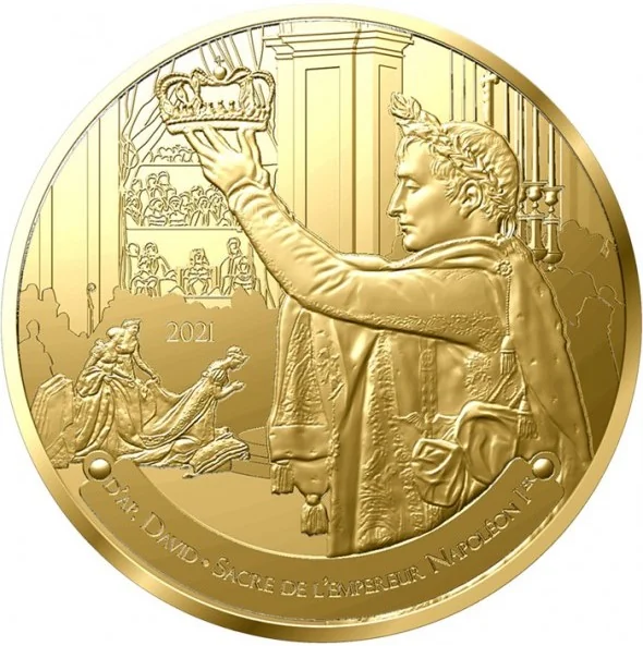 Napoleon holding a crown, evoking Jacques-Louis David's *The Coronation of Napoleon*.