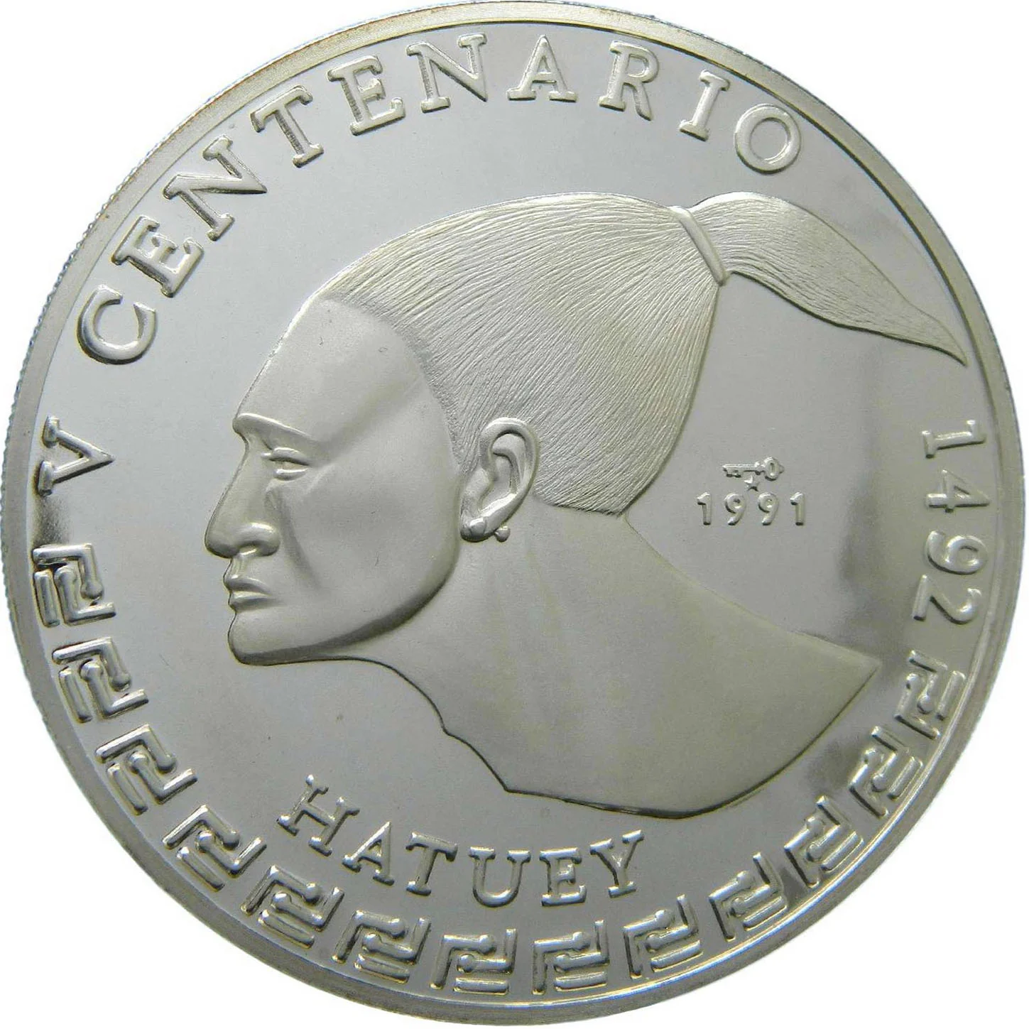 Portrait of Hatuey with name below; event and date in a curved top legend, mintmark and issue date to its right. Native pattern along the lower edge.