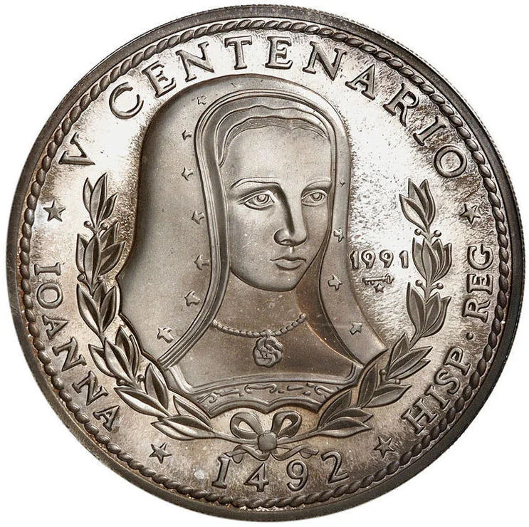 Bust of Queen Joanna with name and title below. Curved legend above, date below. Issue date and mintmark to right. Rope border.
