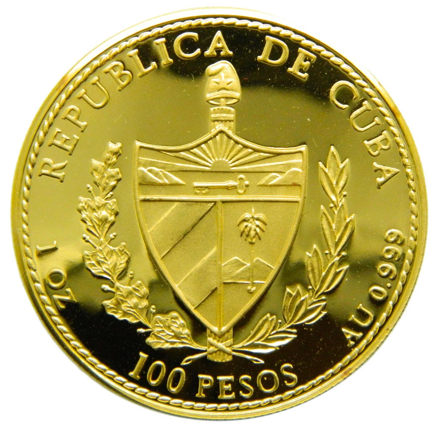Cuban coat of arms with curved country name above, face value below, weight and fineness on sides, rope edge design.
