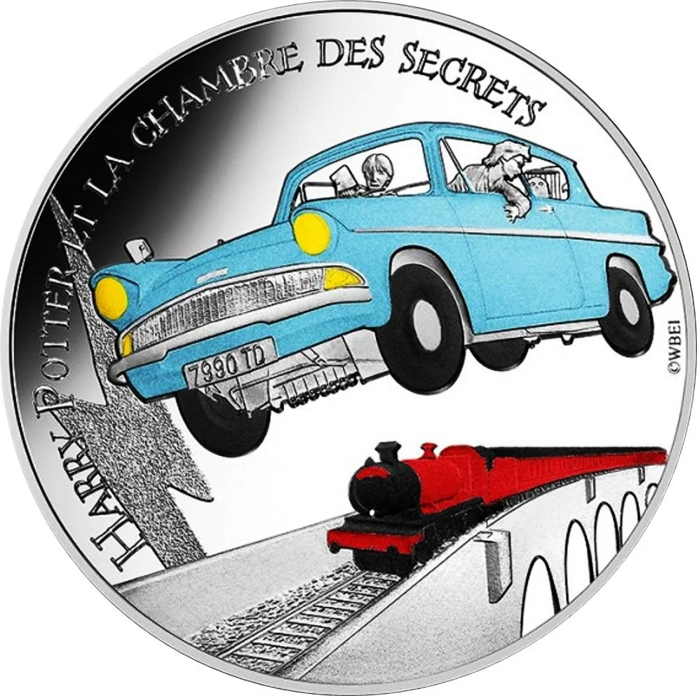 A light blue Ford Anglia 105E Deluxe flies above the Hogwarts Express (from *Harry Potter and the Chamber of Secrets*).