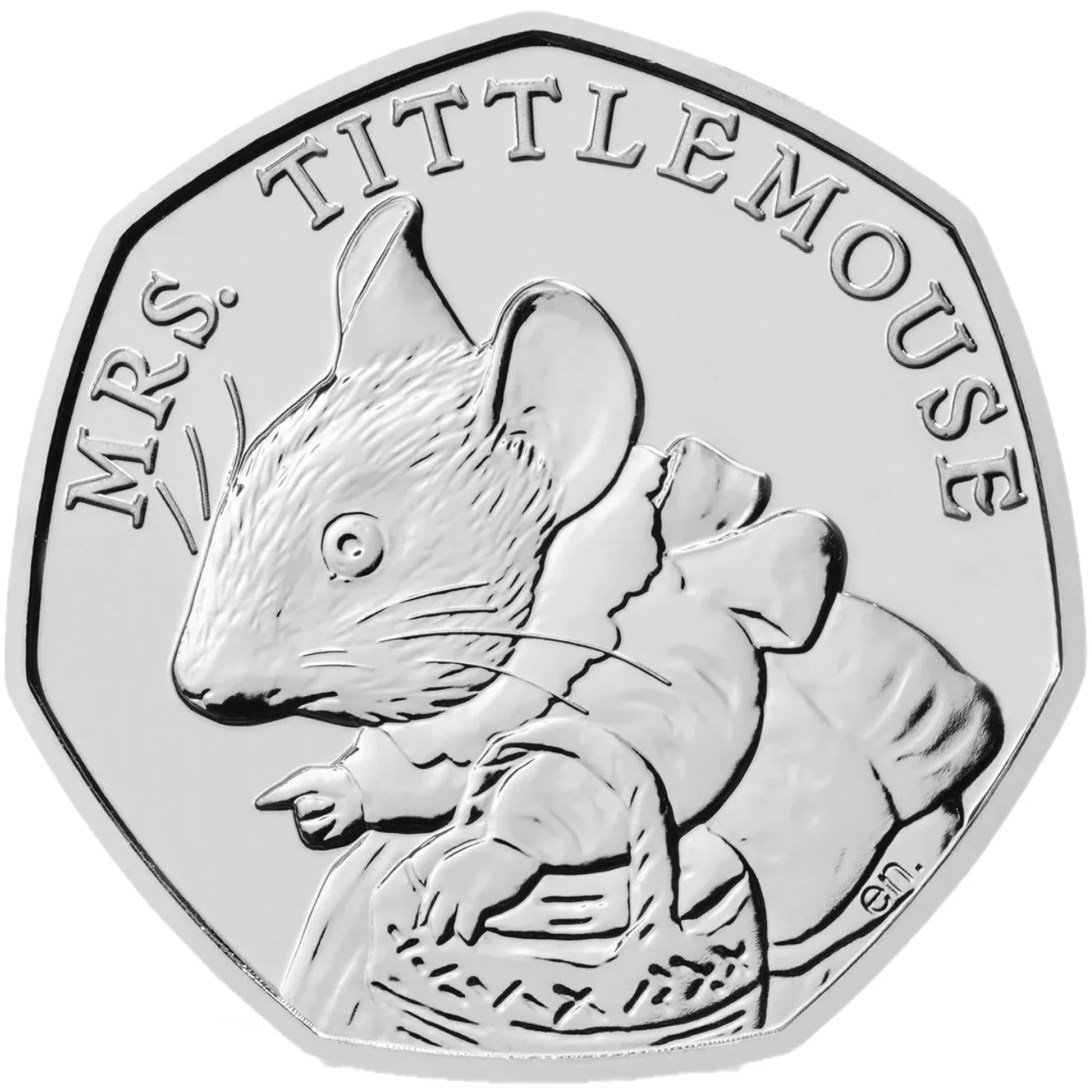 Mrs. Tittlemouse facing left, basket in hand, legend above.