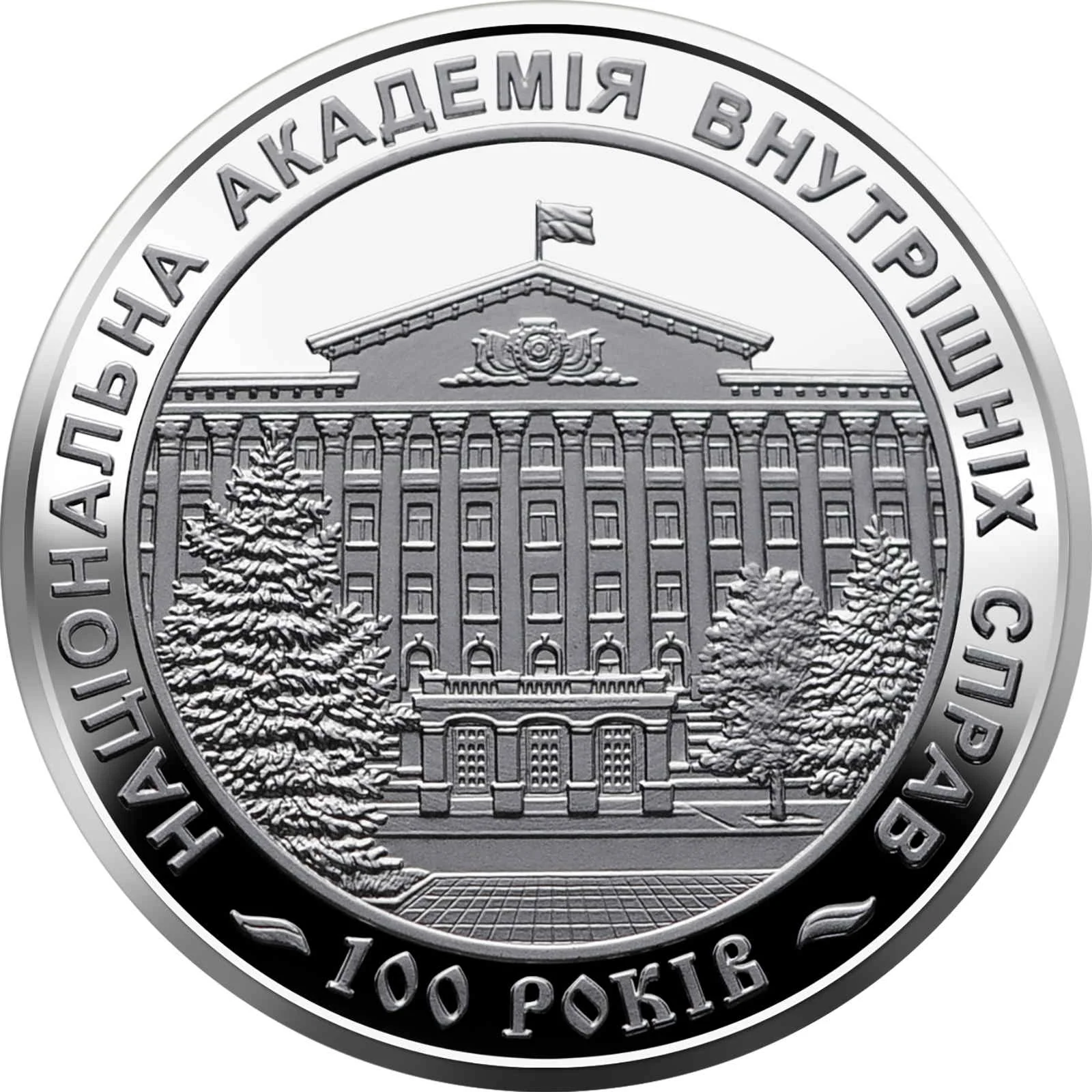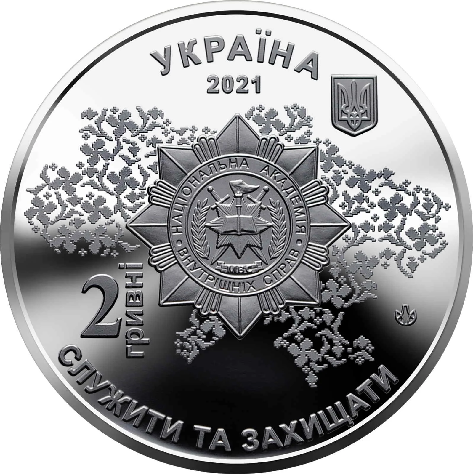 Description: Ukraine's small coat of arms is above right. The center features the National Academy of Internal Affairs logo on a stylized map, surrounded by the legends: "УКРАЇНА/2021" (top), "2/ГРИВНІ" (left), and "СЛУЖИТИ ТА ЗАХИЩАТИ" (below). The NBU mint mark is to the right.