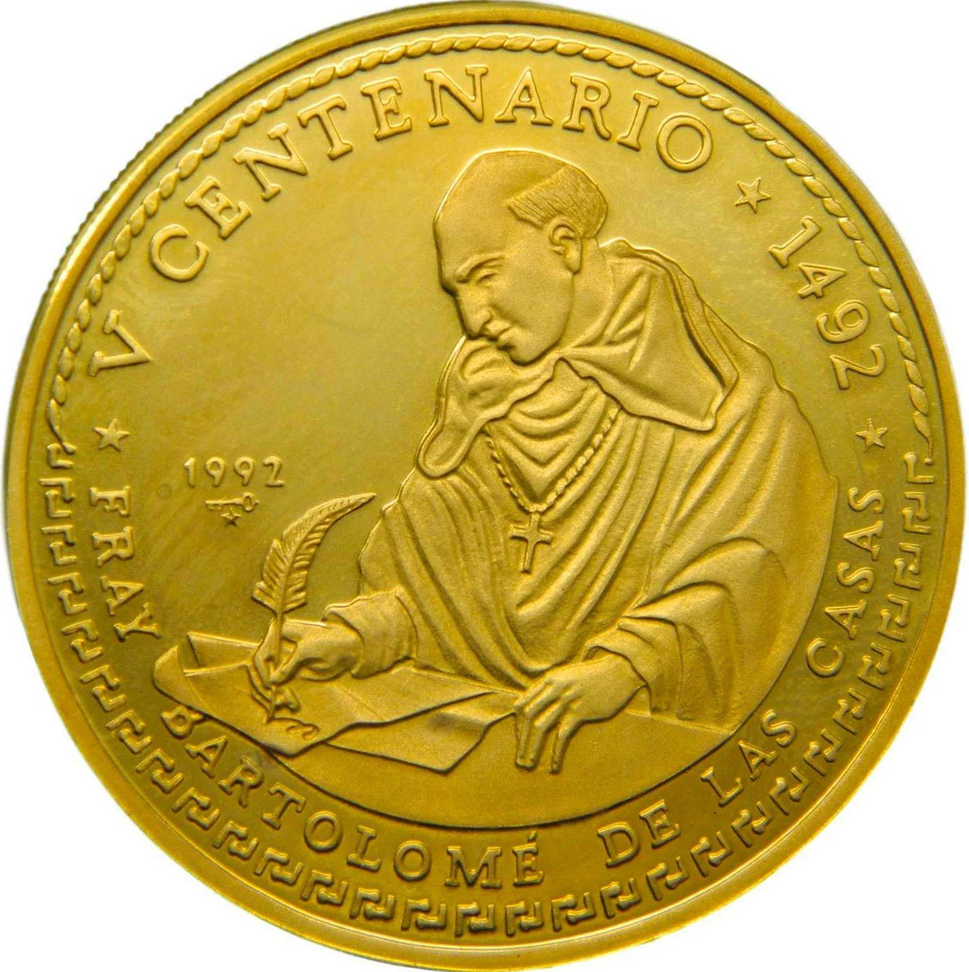 Half-figure of Bartolomé de las Casas writing, with event and year in curved legend above, native pattern below. Figure name in curved legend beneath image, issue date and mintmark at left.
