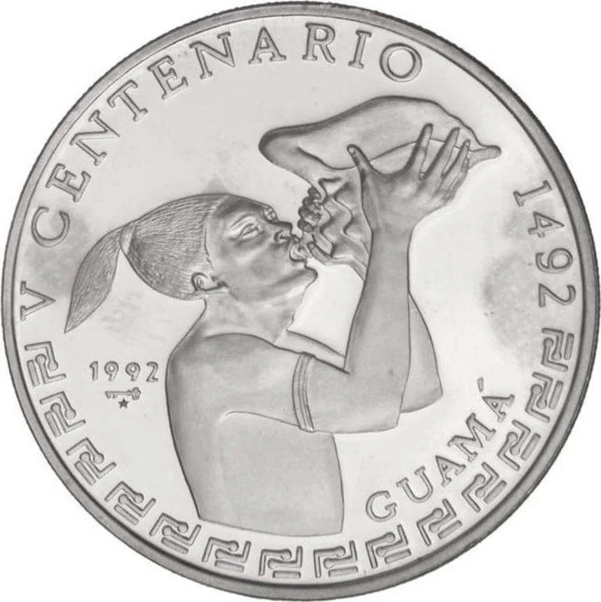 Chief Guama blowing a shell, half-figure. Top half: curved event and year legend. Lower half: native pattern. Right: figure name. Left: issue date and mintmark.