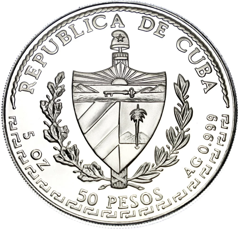 Cuban coat of arms with curved country name above, face value below. Weight and fineness on sides, rope border on upper half, native design on lower half.