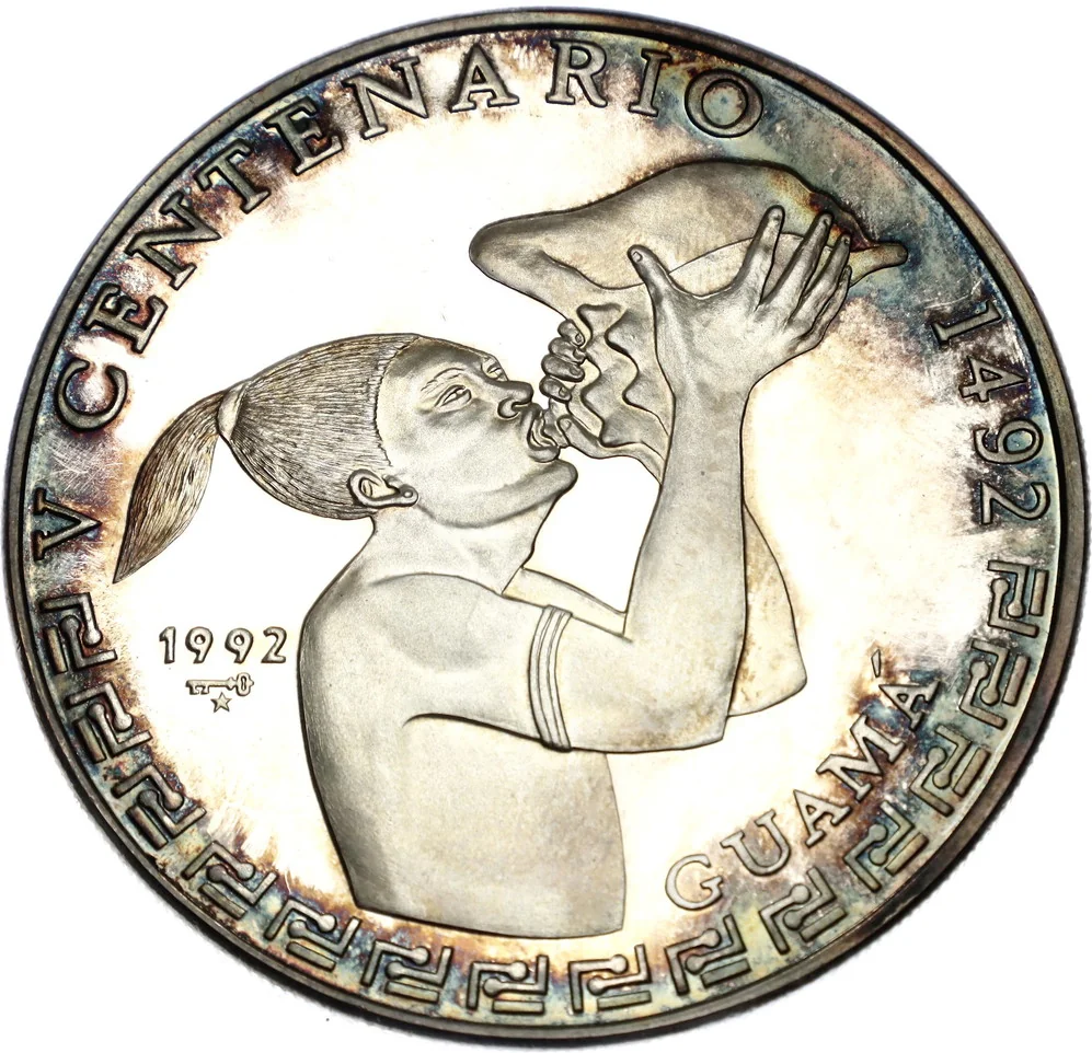 Chief Guama blowing a shell, half-figure. Top half: curved event and year legend. Lower half: native pattern. Right: figure name. Left: issue date and mintmark.