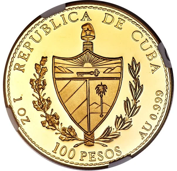 Cuban coat of arms with curved country name above, face value below, weight and fineness on sides, rope edge design.