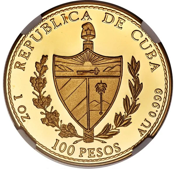Cuban coat of arms with curved country name above, face value below, weight and fineness on sides, rope edge design.