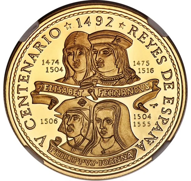 Portraits of Isabella and Ferdinand above Philip and Joanna. Each pair labeled with banners, dates, and flanked by curved legends noting the event, year, and figures; mintmark at right.
