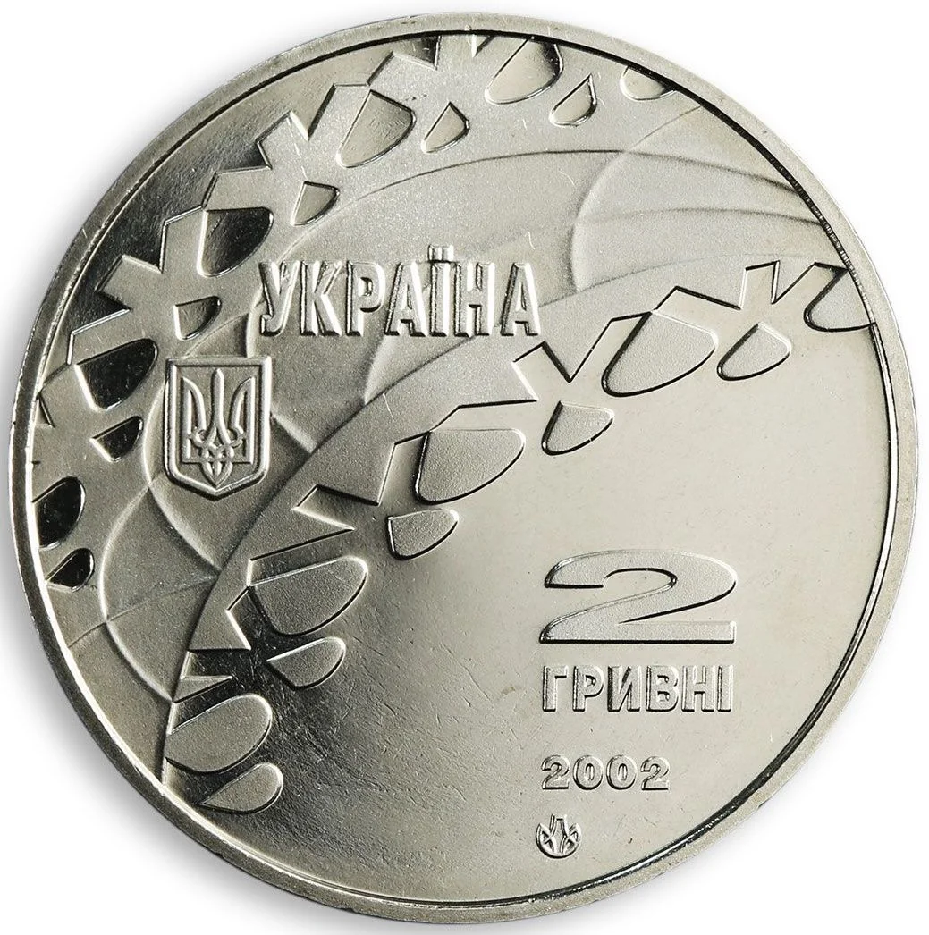 Right: Against a plain field, "2 / ГРИВНІ / 2002" and the Mint logo.