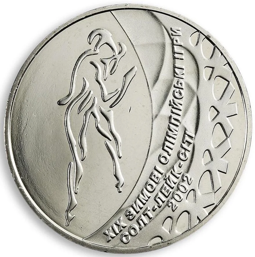 Left: a skater silhouette on glass. Right: "ХІХ ЗИМОВІ ОЛІМПІЙСЬКІ ІГРИ / СОЛТ-ЛЕЙК-СІТІ / 2002" on a snowflake relief.