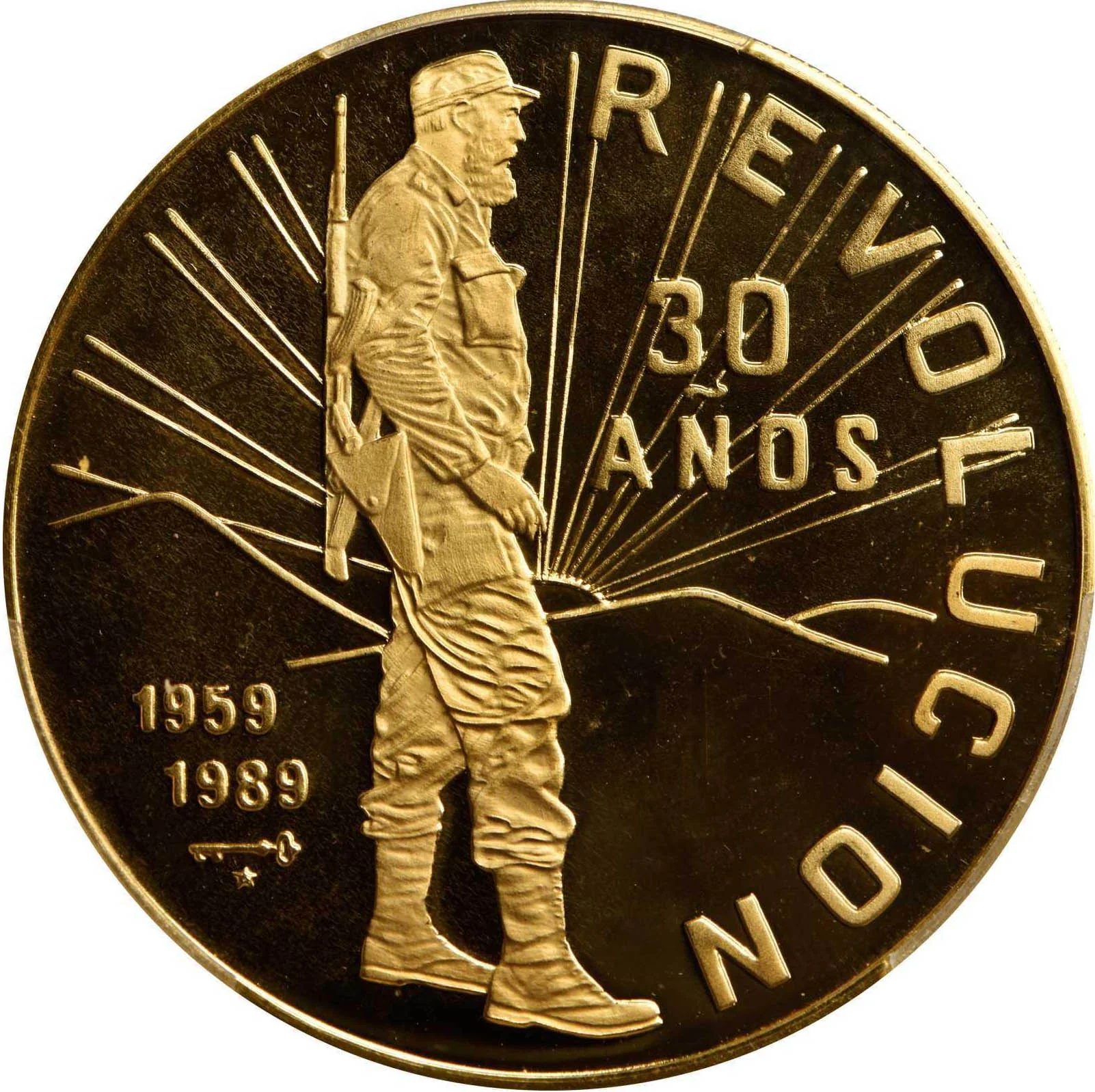 Fidel Castro with gun, mountain and sun behind; event name right, dates and mintmark left.