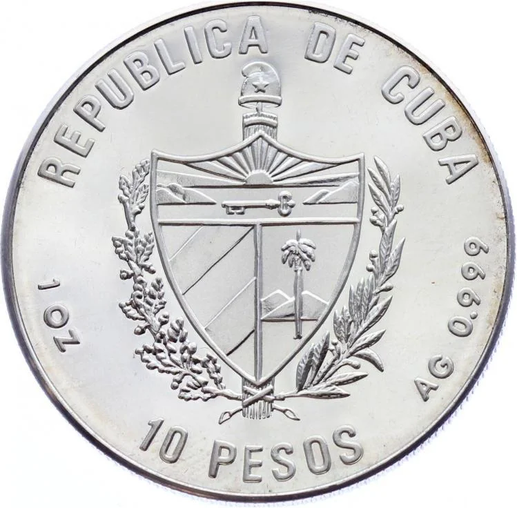 Cuban coat of arms with curved country name above, face value below, and weight and fineness on the sides.