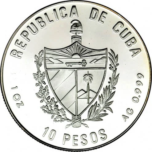 Cuba's coat of arms above curved country name, face value below, flanked by weight and fineness.