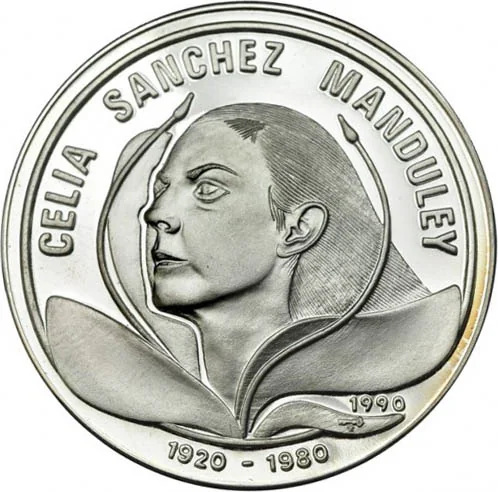 Portrait of Cuban heroine Celia Sánchez Manduley (1920–1980) on a butterfly flower design. Curved name above, dates below, with issue date and mintmark at lower right.