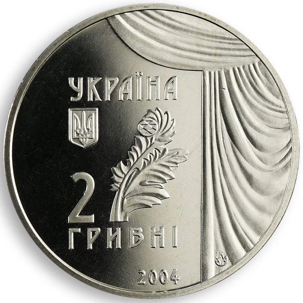 Against a smooth background, the coin features Ukraine's small National Emblem, the inscriptions "УКРАЇНА" and "2 ГРИВНІ / 2004," and a central stylized flower framed by a stage curtain on the right, along with the Mint's logotype.