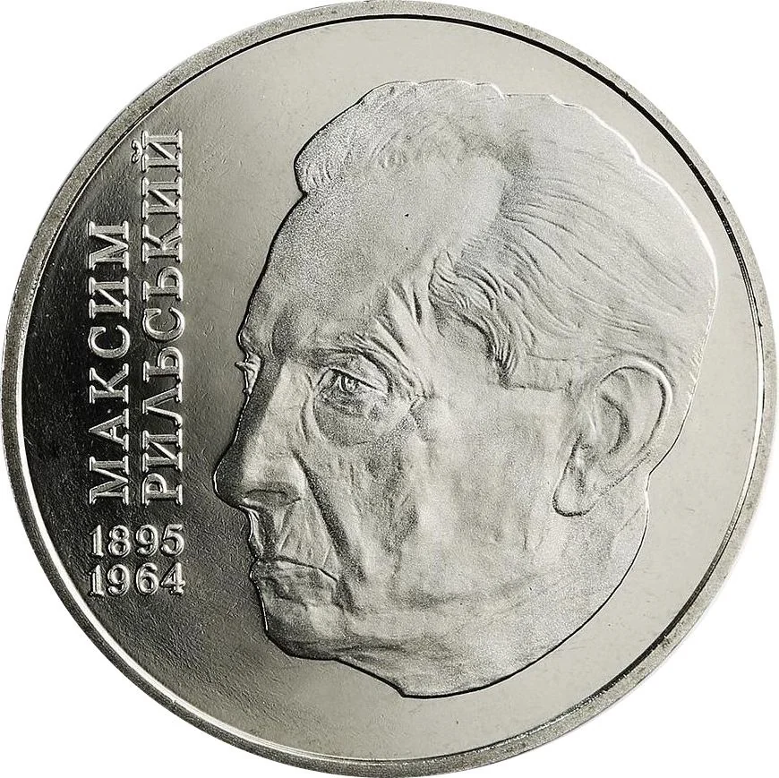 A portrait of Rylsky with a vertical inscription to the left: "МАКСИМ РИЛЬСЬКИЙ" and his lifespan, 1895-1964, below.