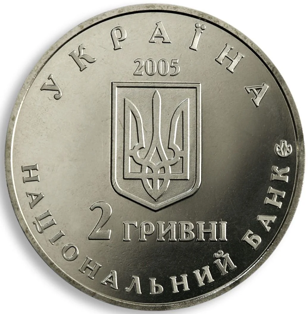 The coin features Ukraine's small National Emblem, the year 2005, and the denomination "2 ГРИВНІ." Around the edge are the inscriptions "УКРАЇНА," "НАЦІОНАЛЬНИЙ БАНК," and the Mint's logo.