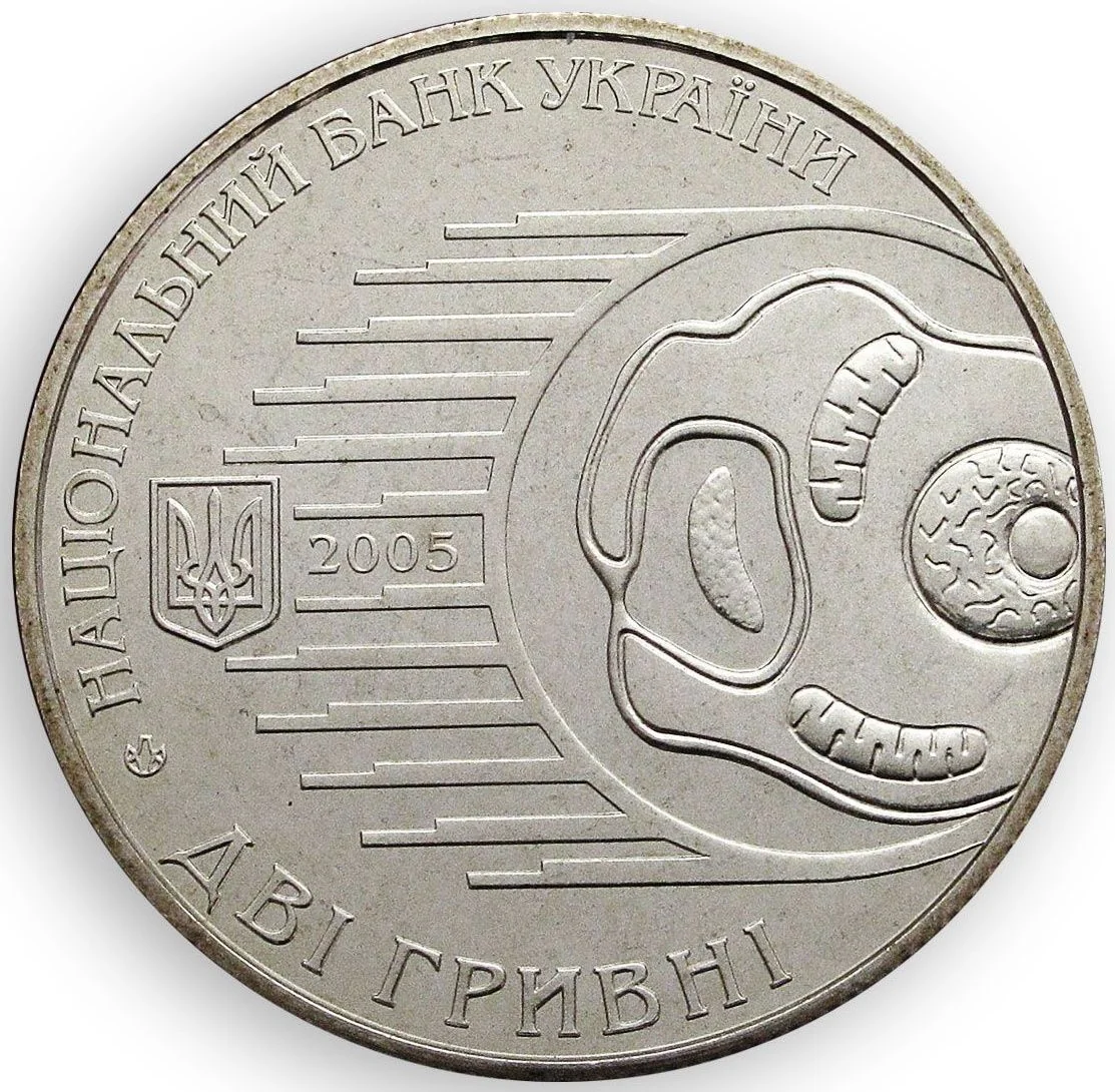 Right: a stylized phagocytosis cell. Left: 2005, coin year, and small National Emblem. Around the edge: "НАЦІОНАЛЬНИЙ БАНК УКРАЇНИ," the Mint logo, and "ДВІ ГРИВНІ."
