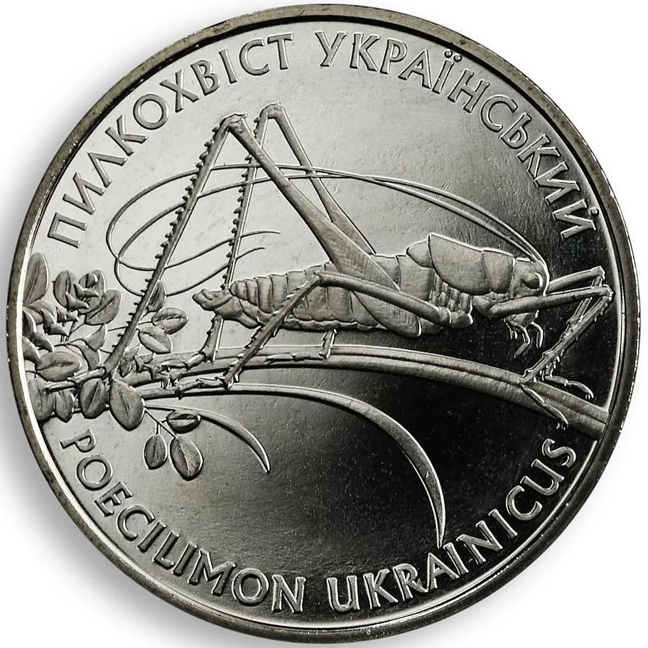A cricket on a grass stem, labeled above as "ПИЛКОХВІСТ УКРАЇНСЬКИЙ" and below as "POECILIMON UKRAINICUS."
